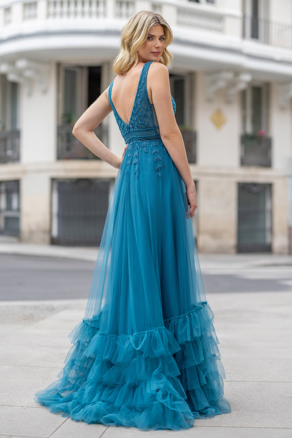 Petrolejové společenské/plesové šaty Erika s tylovou sukní volánky kolekce Christian Koehlert