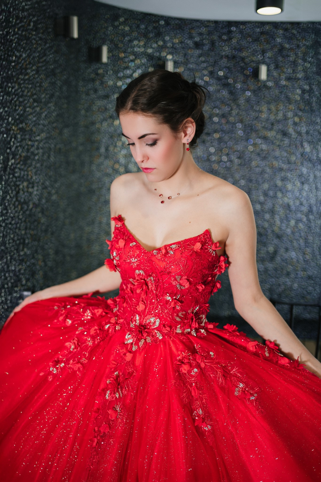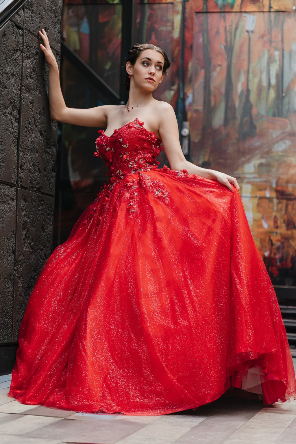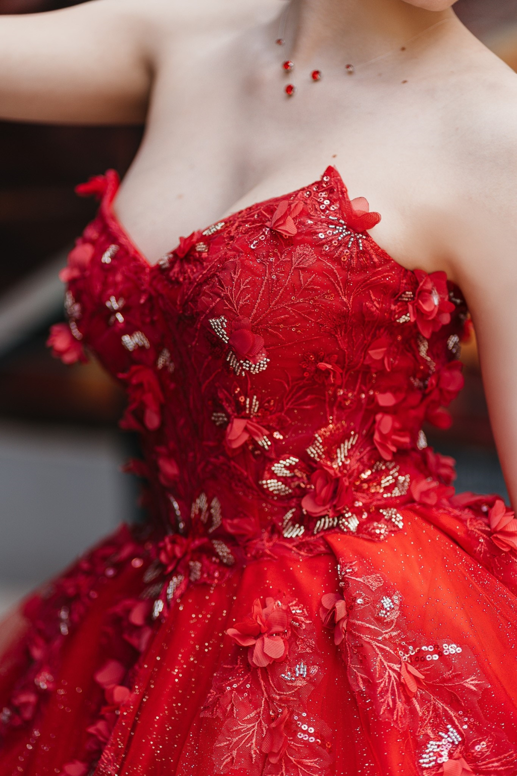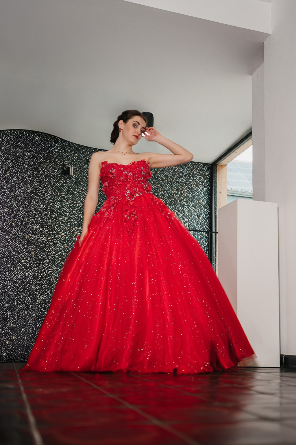 Oslnivý vstup na každém plese či maturitním večírku zaručen! Tyto červené společenské šaty v sobě spojují romantiku i eleganci. Bohatá tylová sukně vytváří okouzlující objem a působivý siluetový efekt, zatímco korzet bez ramínek zdobený jemnou krajkou a stříbrnými korálky krásně zvýrazní vaši postavu.