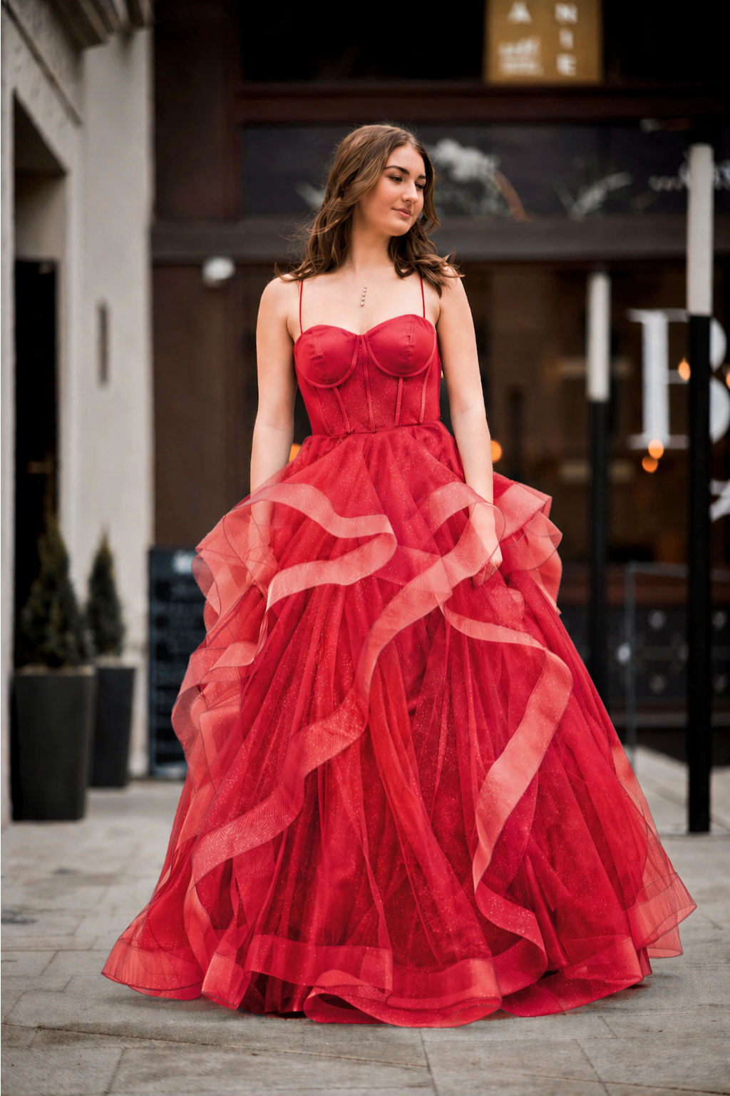 Výrazné společenské šaty v sytě červeném odstínu, které na první pohled zaujmou svou elegancí i jemnou hravostí. Korzetový živůtek s kosticemi krásně tvaruje postavu a zvýrazňuje dekolt, zatímco tenká ramínka dodávají modelu lehkost.