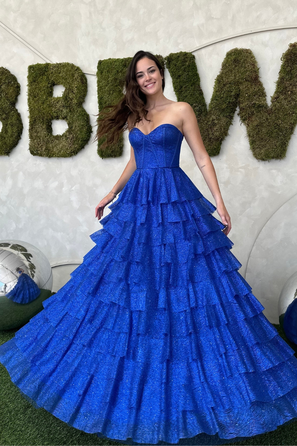Zazařte na plese nebo maturitním večírku v těchto dechberoucích královsky modrých společenských šatech, které kombinují pohádkový vzhled s moderní elegancí. Šaty mají výraznou objemnou vrstvenou sukni s volány, která působí luxusně a dodá každému kroku lehkost a dramatičnost.