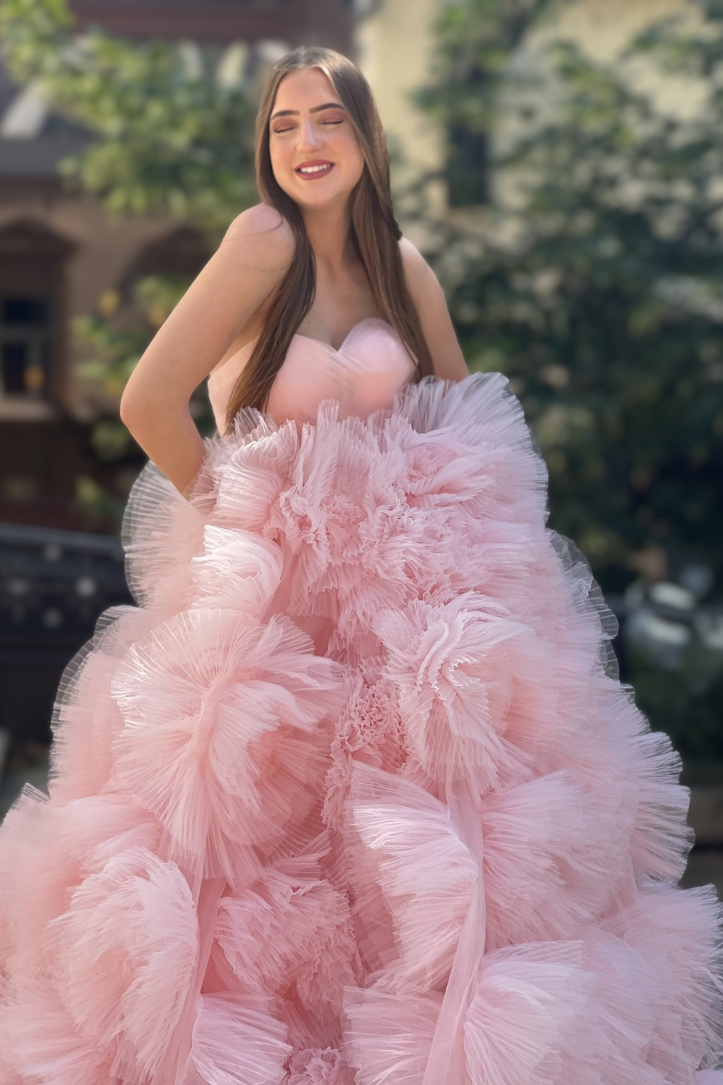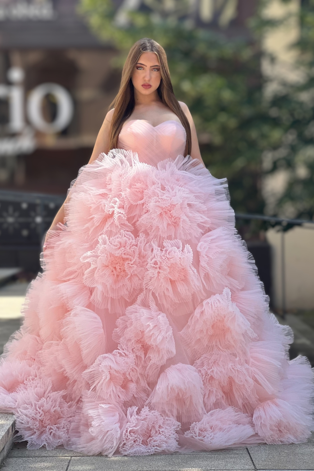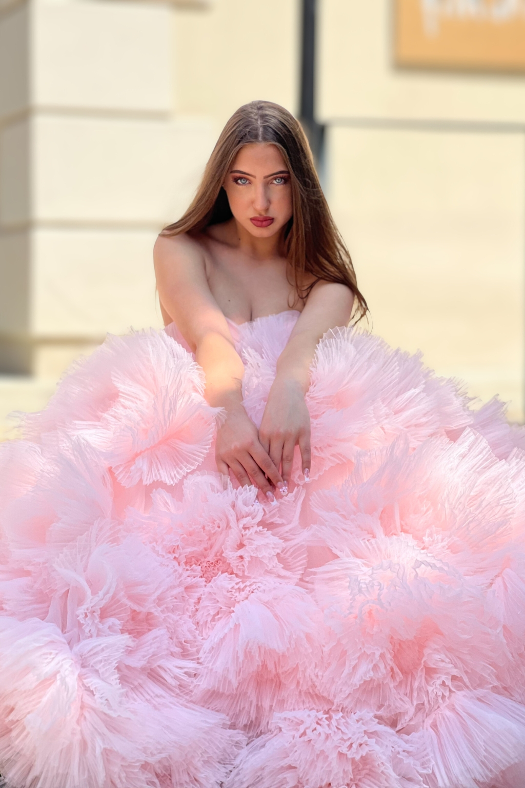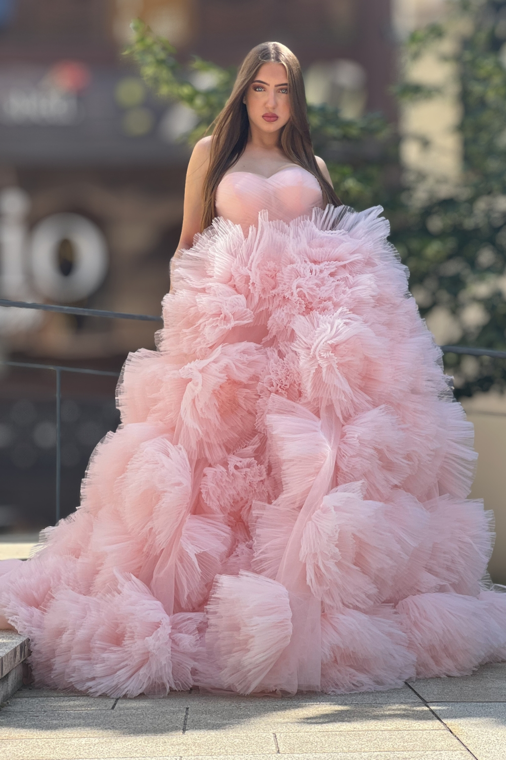 Staňte se královnou večera v těchto snových společenských šatech ve světle růžovém odstínu. Dominantou modelu je obrovská vrstvená tylová sukně, která působí až pohádkově – zdobená plastickými tylovými květy dodává šatům romantický a luxusní vzhled.
