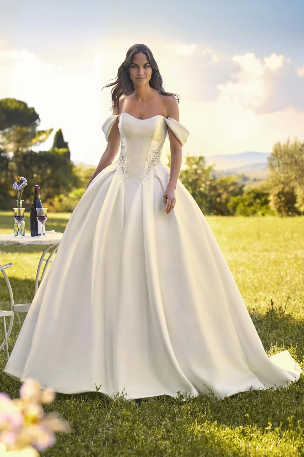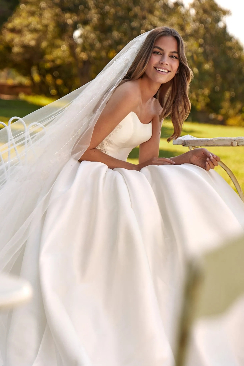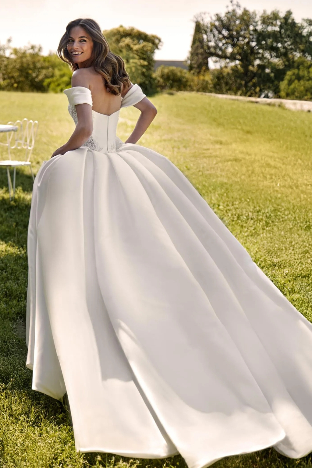 Svatební šaty Sebazia s objemnou mikádovou sukní kolekce Nicole Milano 2026