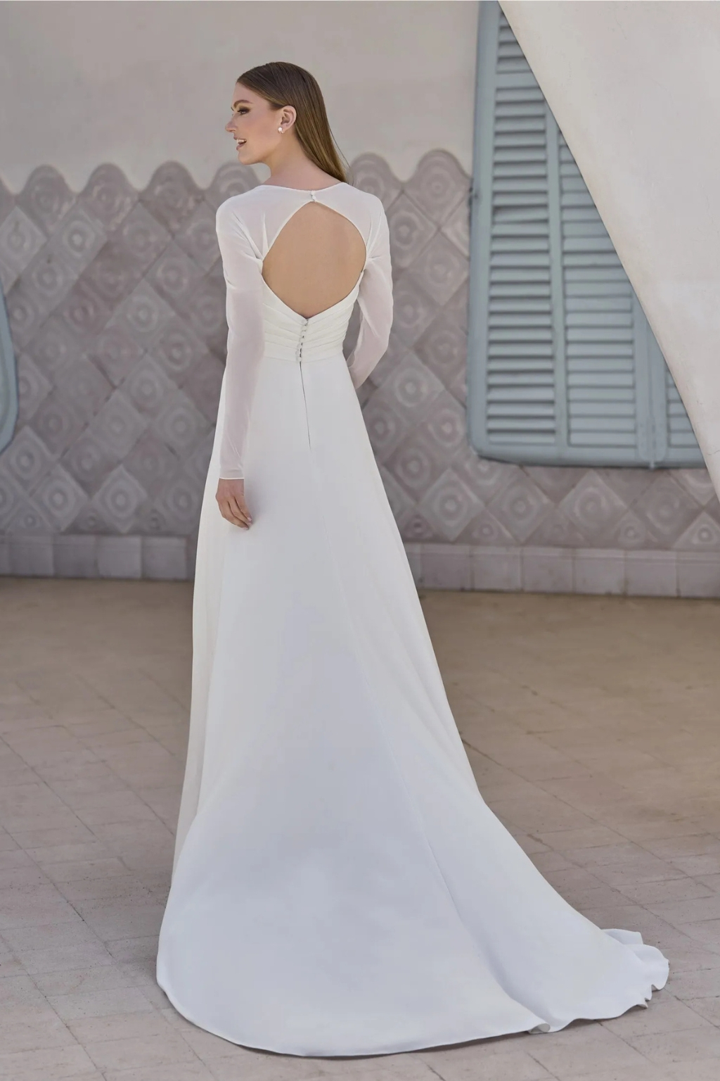 Minimalistické bílé svatební šaty Rosselini kolekce Pronovias 2026 z hladkého krepu s dlouhými rukávy a odhalenými zády