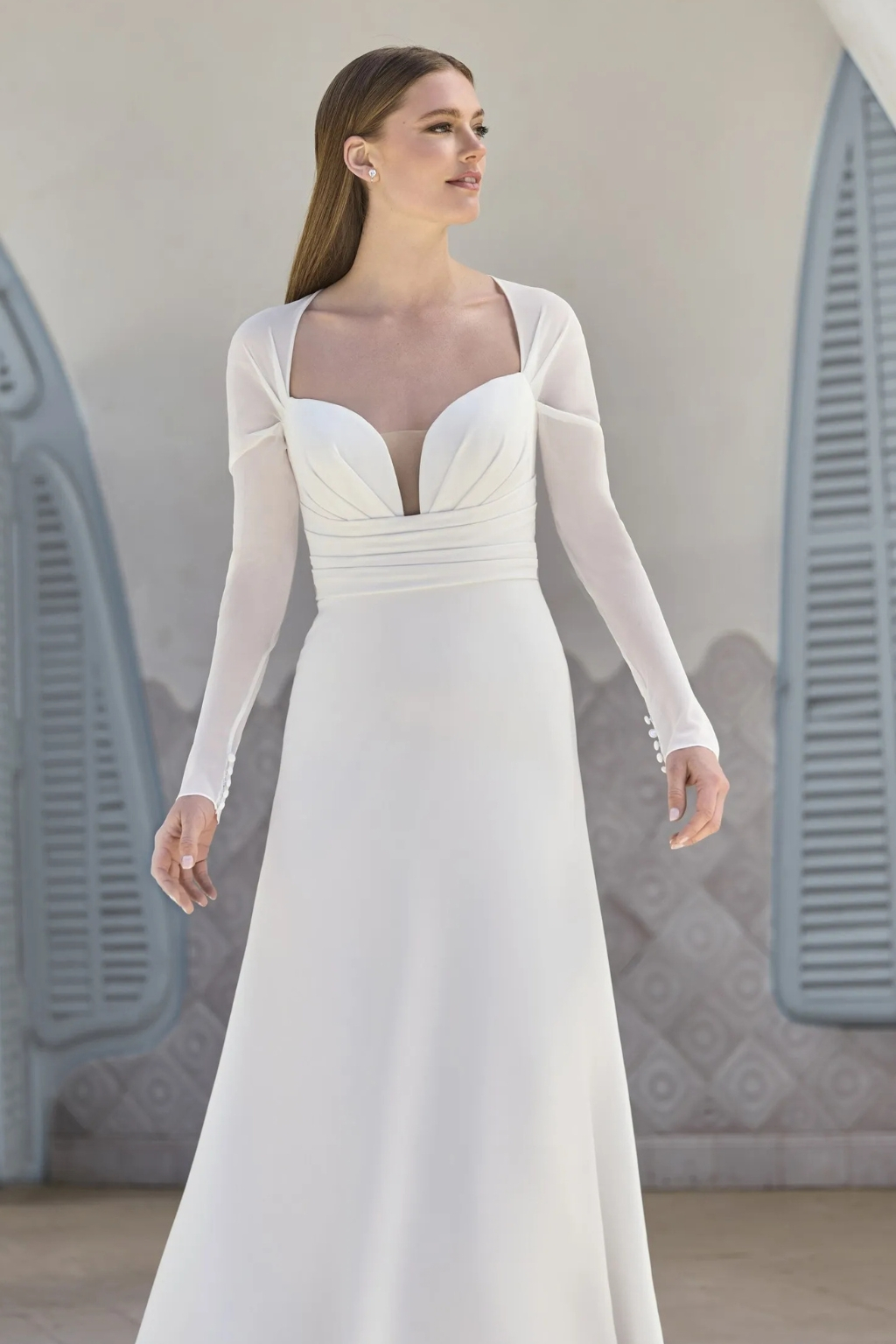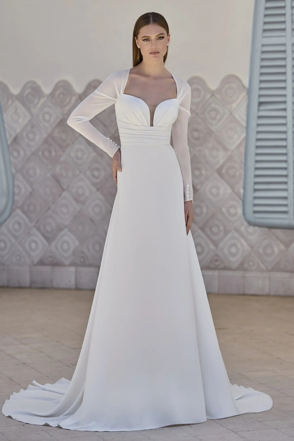 Bílé minimalistické svatební šaty Rosselini s dlouhými rukávy kolekce Pronovias 2026