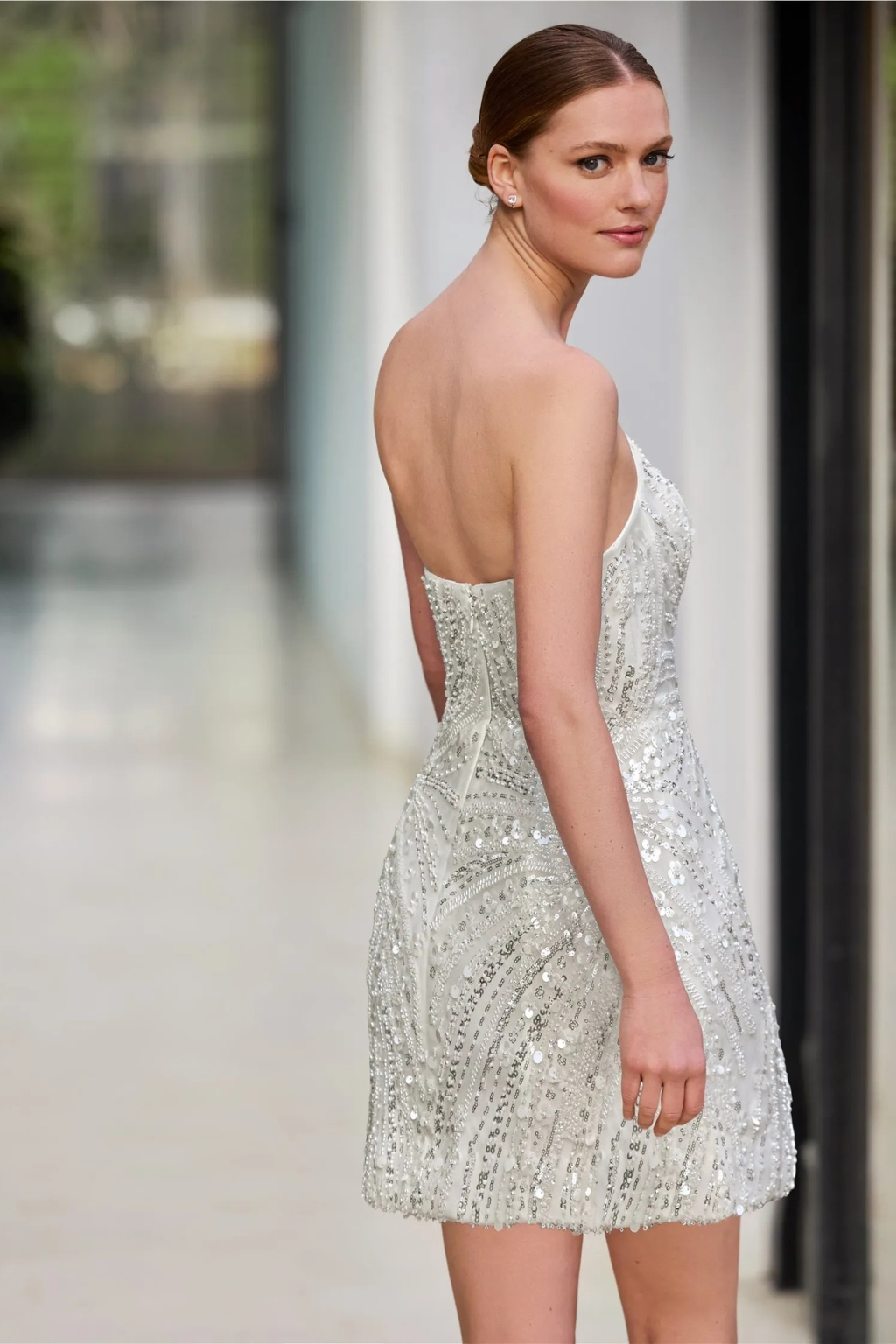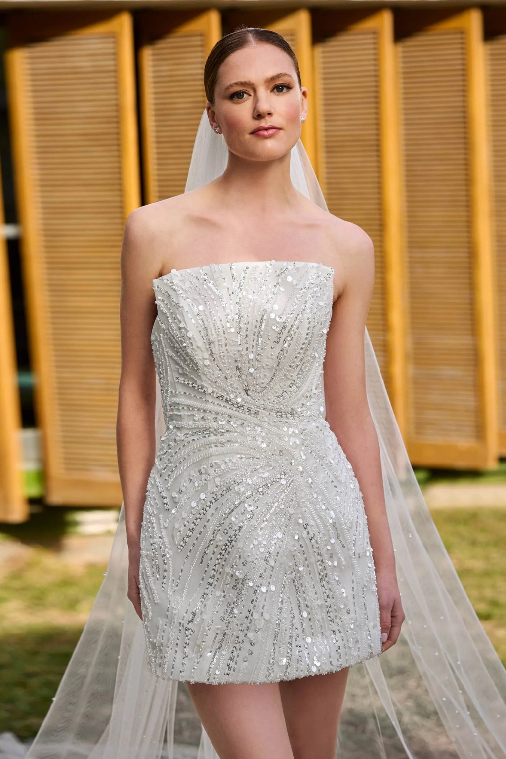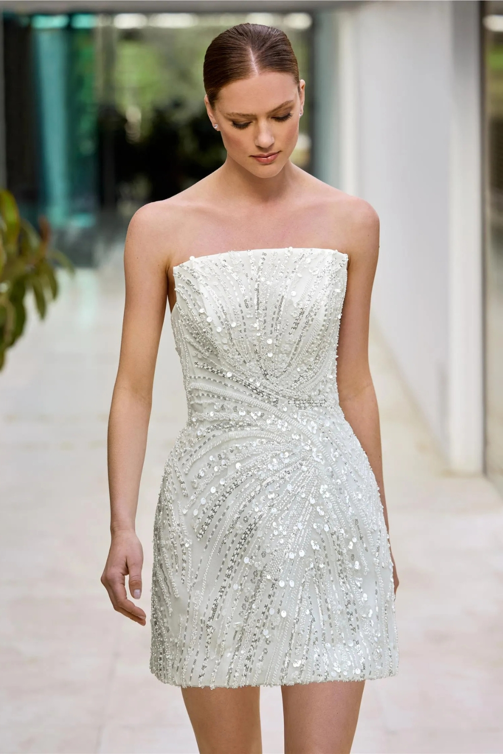 Krátké svatební šaty Arroyn kolekce Pronovias 2026 mini svatební šaty s třpytivým zdobením a korzetem bez ramínek