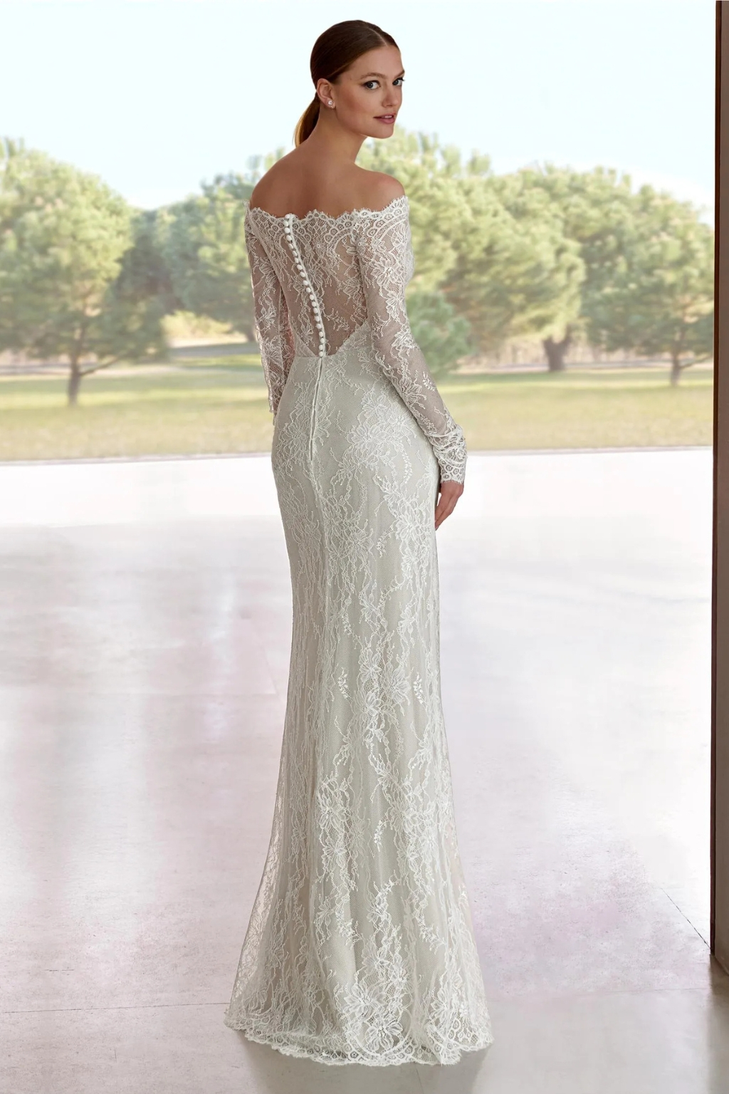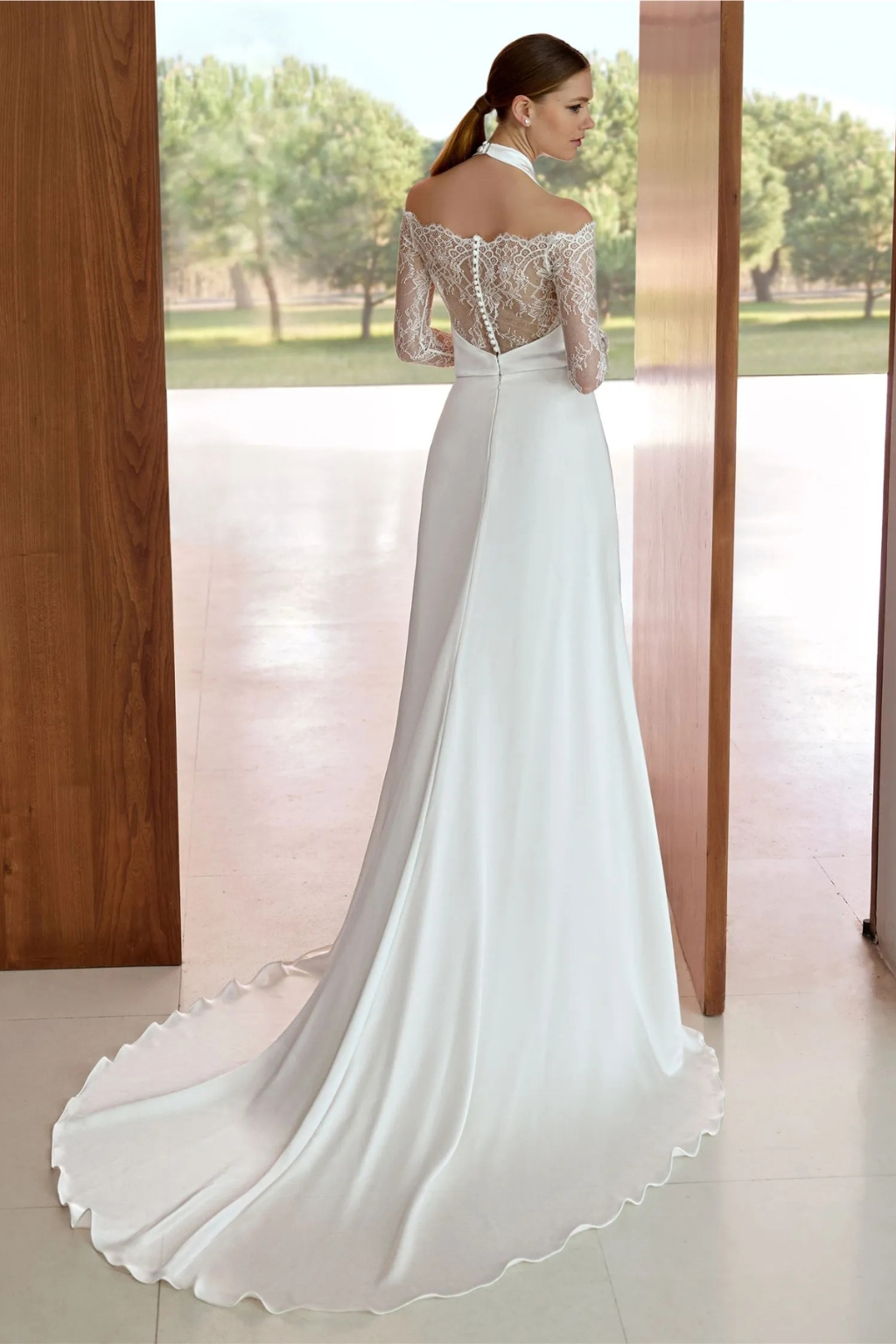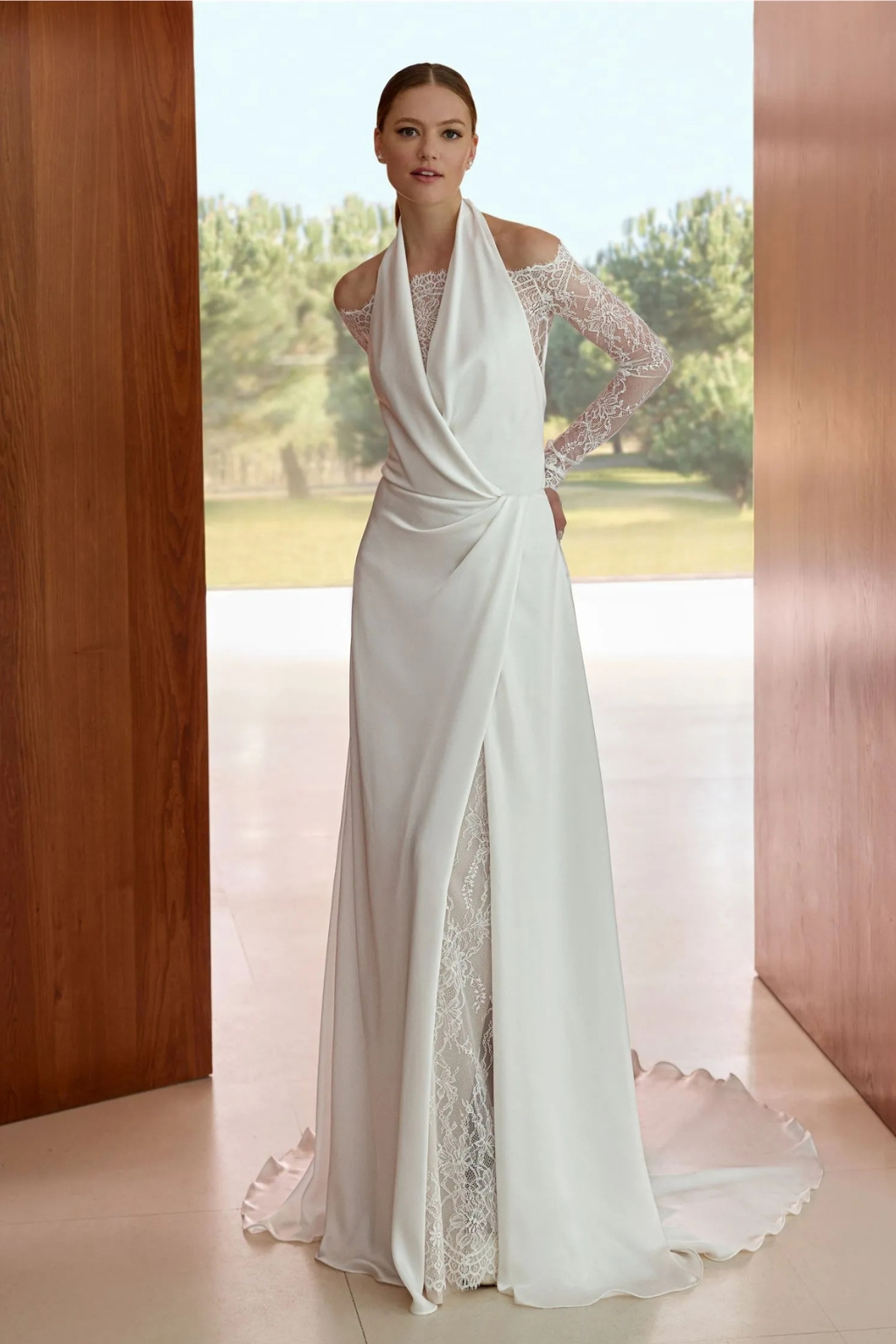 Svatební šaty Dolca kolekce Pronovias 2026 dvoudílný set - krajkové šaty s dlouhými rukávy a saténový vrchní díl s rozparkem dodává šatům eleganci a objem