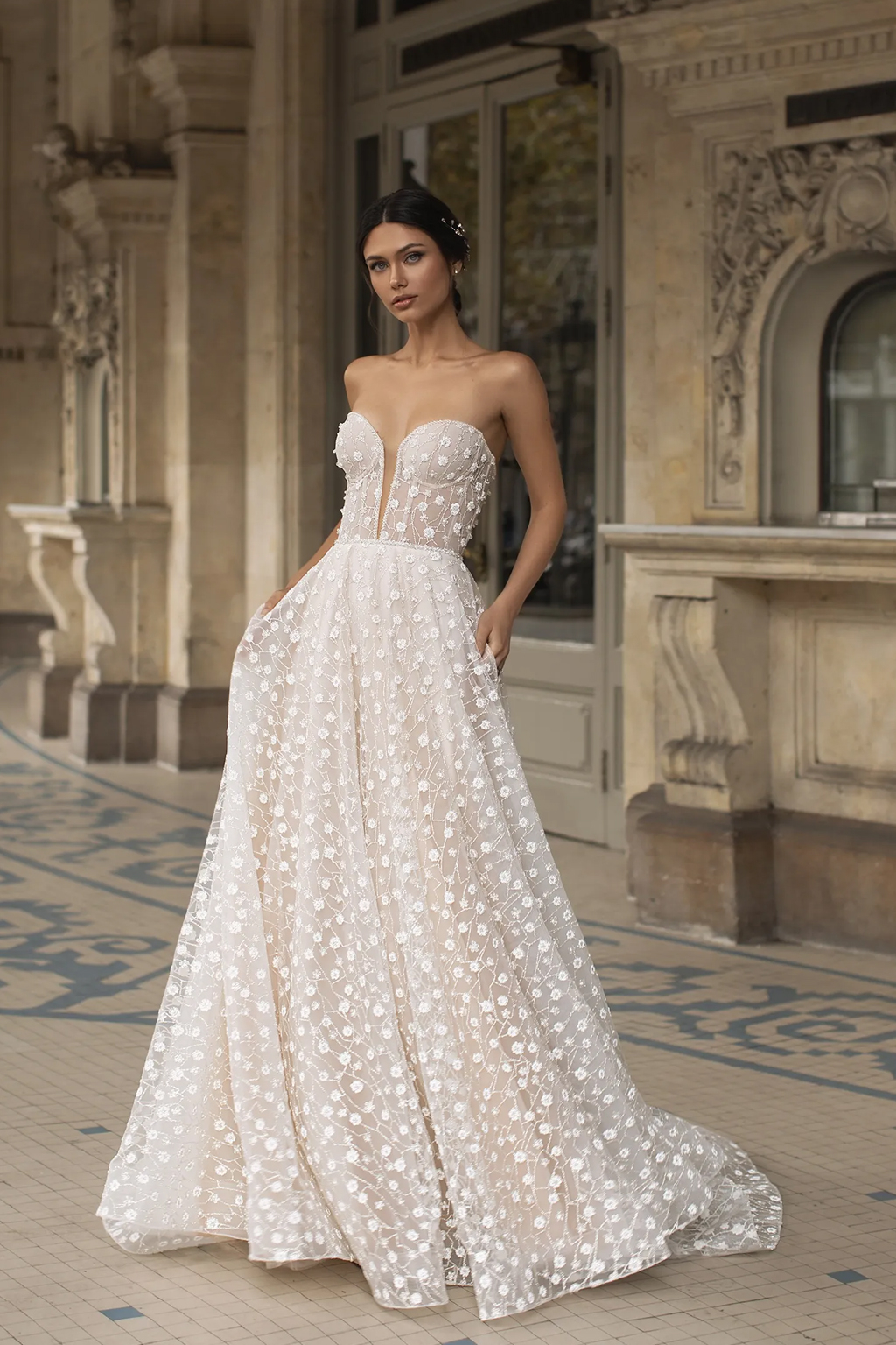 Svatební/společenské šaty Hopkins s květinovou výšivkou kolekce Pronovias 2024