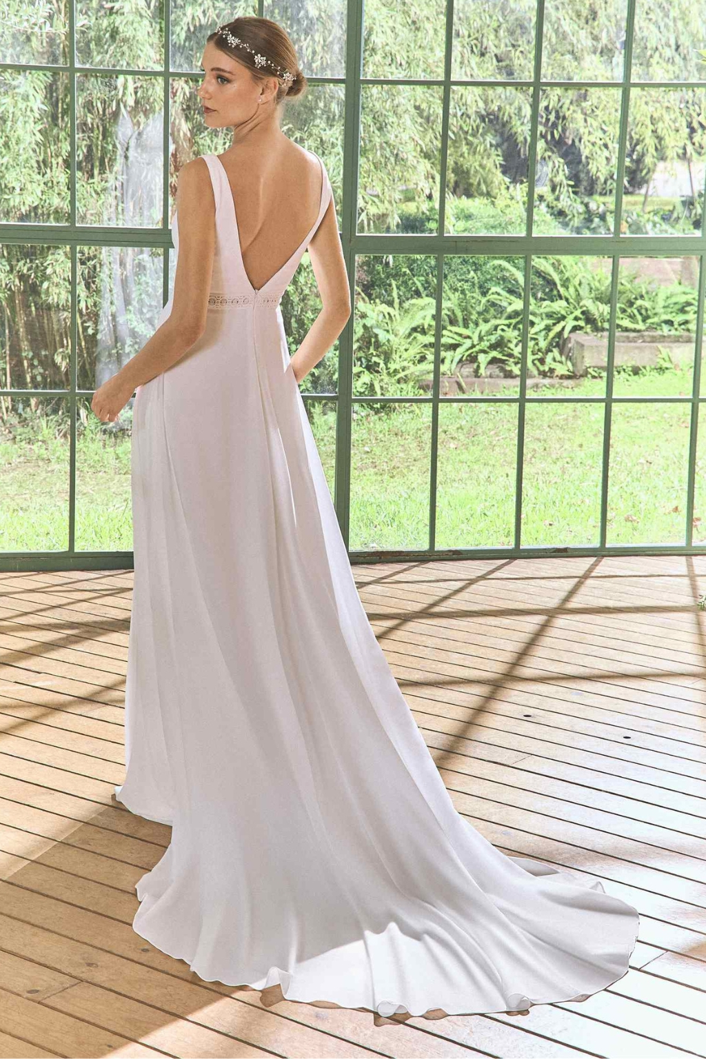 Svatební šaty Cardoso kolekce White One 2026 se splývavou šifonovou sukní s vlečkou a živůtkem bez rukávů s odhalenými zády